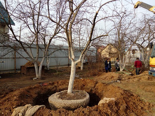 Пересадку крупномеров лучше всего проводить весной, в самом начале сезона. Приступаем к выкопке с внешней стороны вырытой ямы, стараясь сохранить все небольшие корни. Для следующего этапа понадобиться несколько человек, ведь придется нагибать дерево в разные стороны, при этом острой лопатой перерезая нижние корни, вросшие глубоко в грунт.